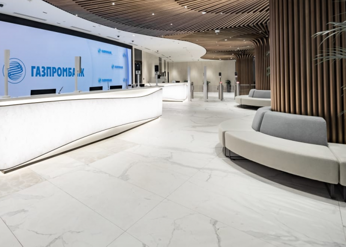 Стойки ресепшен, расположенные на первом этаже, выполнены из искусственного камня с внутренним наполнением: гнутый фасад -светопрозрачный камень Hi-Macs M603 Aurora Pavia, прямая часть — камень Hi-Macs S034 Diamond White. Стойки ресепшен на других этажах выполнены из искусственного камня Hi-Macs S034 Diamond White и Kerrock 729 Adriatic Blue. Общее количество изготовленных стоек – 14 штук.